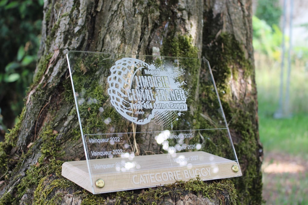 Fabrication de 5 trophées en chêne et acrylique pour le club de trial 4×4 et Buggy du Limousin-Centre-France.