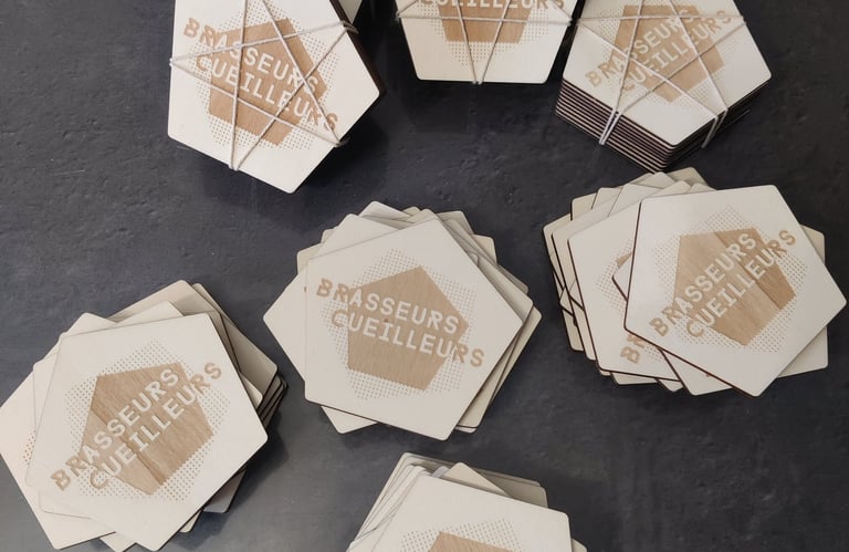 Pour mon premier projet, la brasserie « Brasseurs Cueilleurs » a passé commande de 100 dessous de verre en contreplaqué. Merci pour leur confiance !